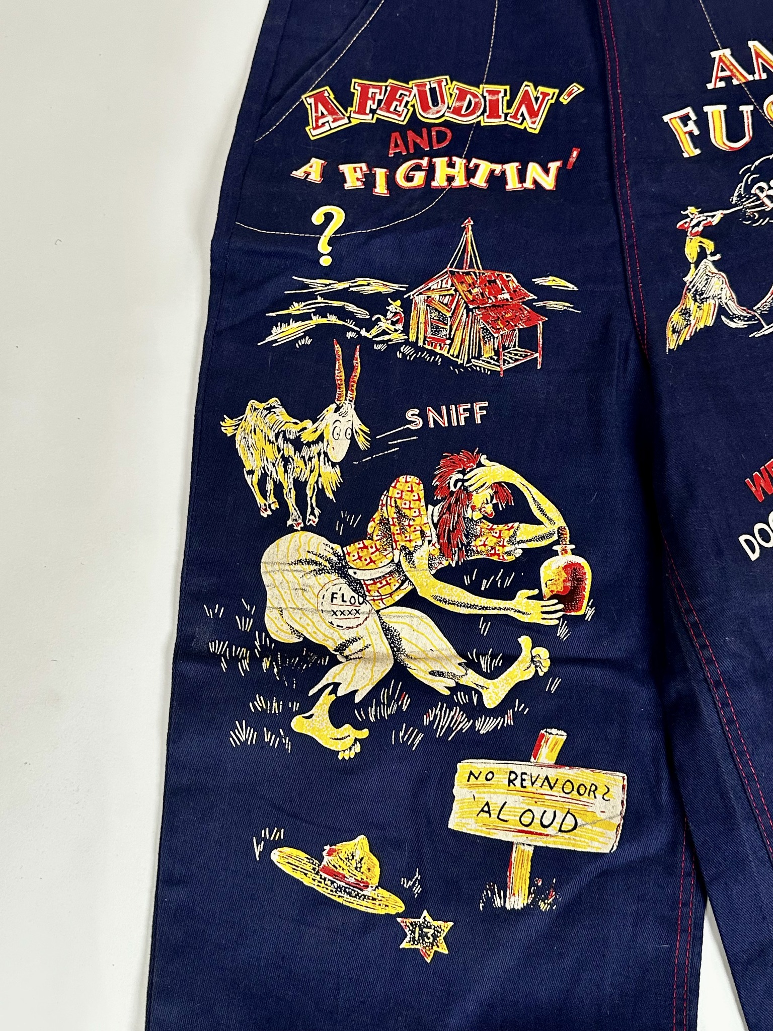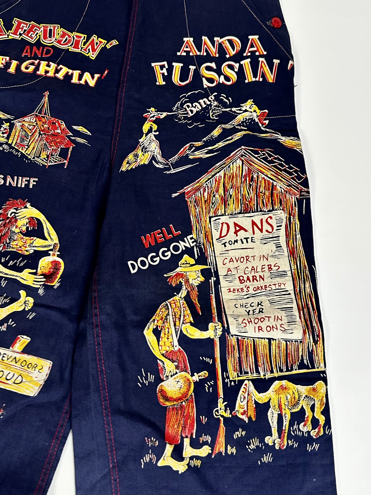 These are unworn NOS 1940s novelty print side-button denim pants (jeans?) with an absolutely incredible (and unwashed/unfaded) hillbilly theme print. Looking at these pants gives me more inner peace than Siddhartha experienced when he tracked down Buddha. But it’s time to sell them. Just as Siddhartha got rid of all his earthly possessions in the Hermann Hesse novel, so shall I, slowly but surely. And these jeans just don’t quite fit me… so…